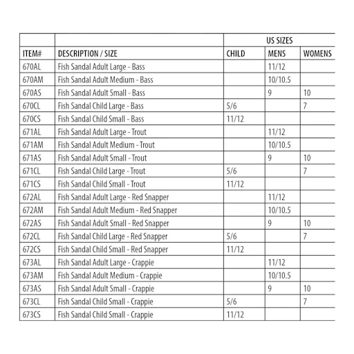 This material is also completely waterproof, so you can wear your favorite footwear to the pool, beach, or lake. The textured, contoured foot bed provides a comfortable slip-resistant surface and supports your feet while you walk. The fish sandals are carefully hand painted to match their respective fish species. Offered in child size large and small to accommodate children and adults with small feet. Washing your finned friends is easy; simply rinse the sandals off with cool water to restore them to their original cleanliness. The fish sandals are quite a catch as a humorous, practical addition to your collection of footwear.